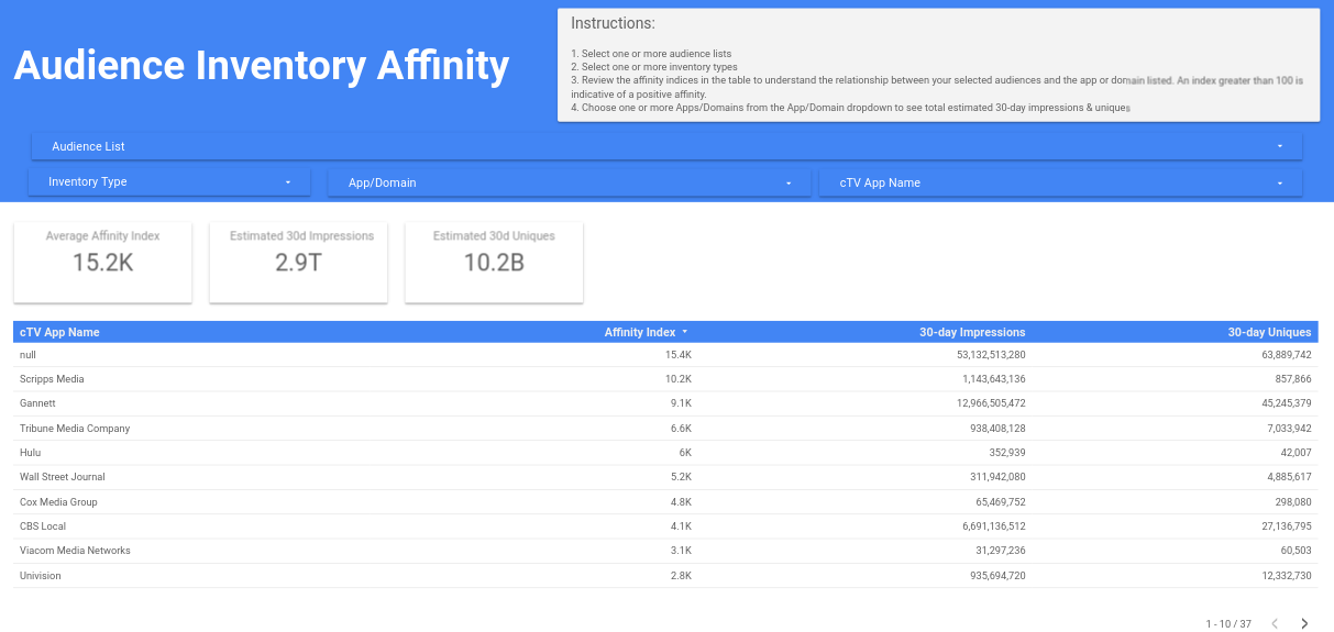 The cTV Audience Affinity dashboard is designed to give clients insights into which cTV apps their audiences have a high affinity for using. The goal of this dashboard is to provide some assistance with the lack of audience targeting for cTV within DV360.